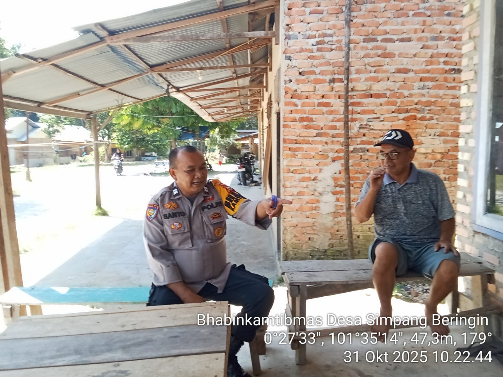 PELALAWAN II Bhabinkamtibmas Desa Simpang Beringin, Aiptu Susanto, melaksanakan giat sambang dan sosialisasi Karhutla di Desa Simpang Beringin. Kegiatan ini bertujuan untuk meningkatkan kesadaran masyarakat akan pentingnya menjaga lingkungan dan mencegah kebakaran hutan dan lahan. Jumat,31Oktober 2025