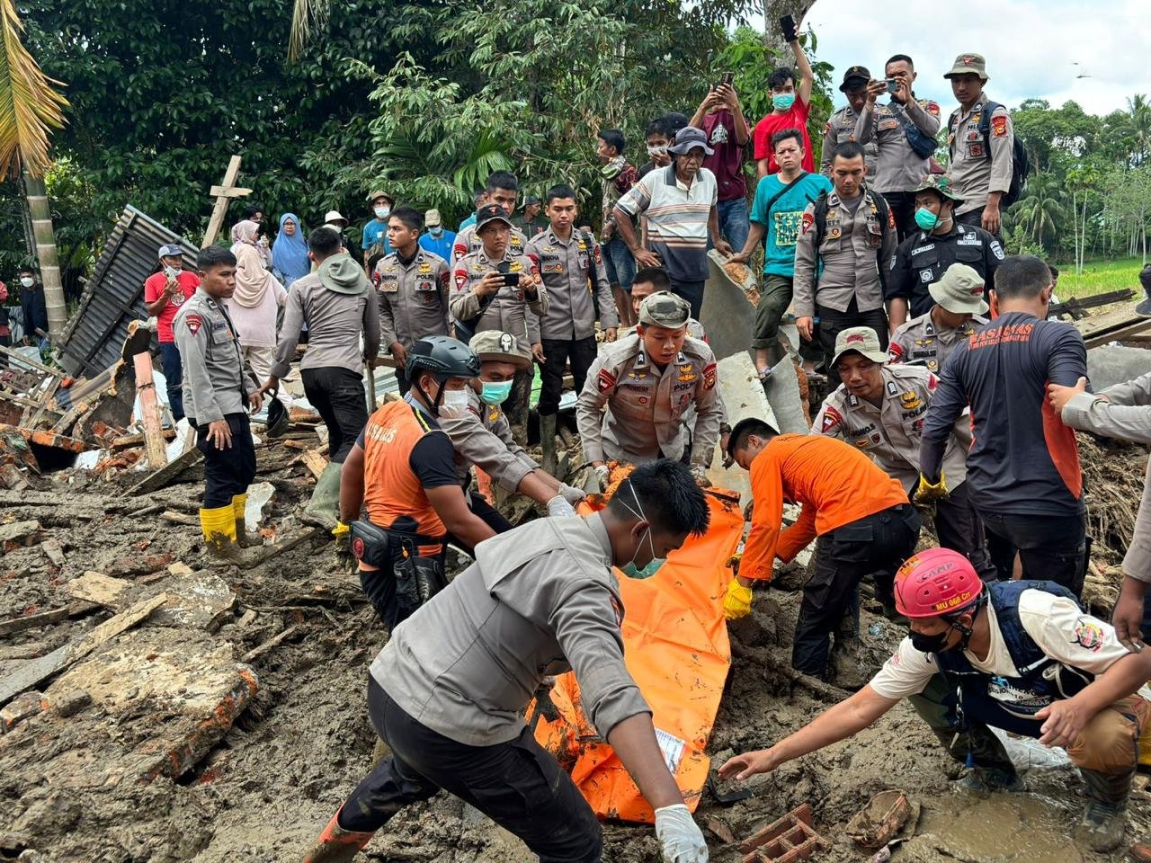 Evakuasi jenazah Samsimar berlangsung dengan penuh kehati-hatian dan penghormatan. Tangis keluarga pecah saat jenazah akhirnya berhasil dibawa ke tempat yang aman.
