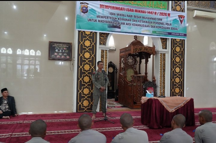 Pekanbaru – Satuan Brimob Polda Riau menggelar peringatan Isra Mikraj Nabi Muhammad SAW 1447 Hijriah/2026 M sebagai upaya memperteguh keimanan dan ketakwaan personel Polri dalam menjalankan tugas pengabdian kepada masyarakat, khususnya dalam aksi kemanusiaan dan kepedulian sosial.