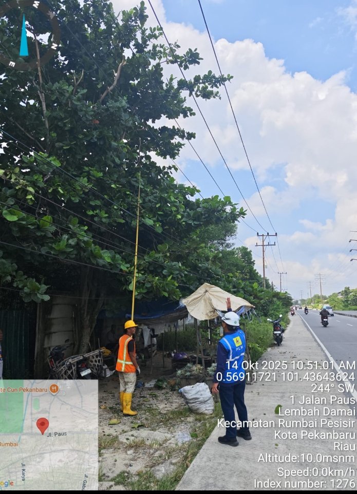 Pekanbaru – Dalam upaya menjaga keandalan pasokan listrik bagi pelanggan, PLN Unit Layanan Pelanggan (ULP) Rumbai melaksanakan kegiatan pemangkasan dahan dan ranting pohon yang mengganggu jaringan kabel listrik di sepanjang Jalan Paus, Kelurahan Lembah Damai, Kecamatan Rumbai Pesisir, Kota Pekanbaru, pada Selasa (14/10/2025).