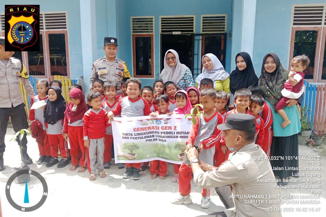 PELALAWAN II Polres Pelalawan melalui Polsek Bandar Sei Kijang melaksanakan kegiatan penanaman bibit pohon di halaman TK Mayang Lestari, Desa Lubuk Ogung, Kec. Bandar Sei Kijang, Kab. Pelalawan. Kegiatan ini berlangsung pada Kamis, 23 Oktober 2025, pukul 10.00 WIB.