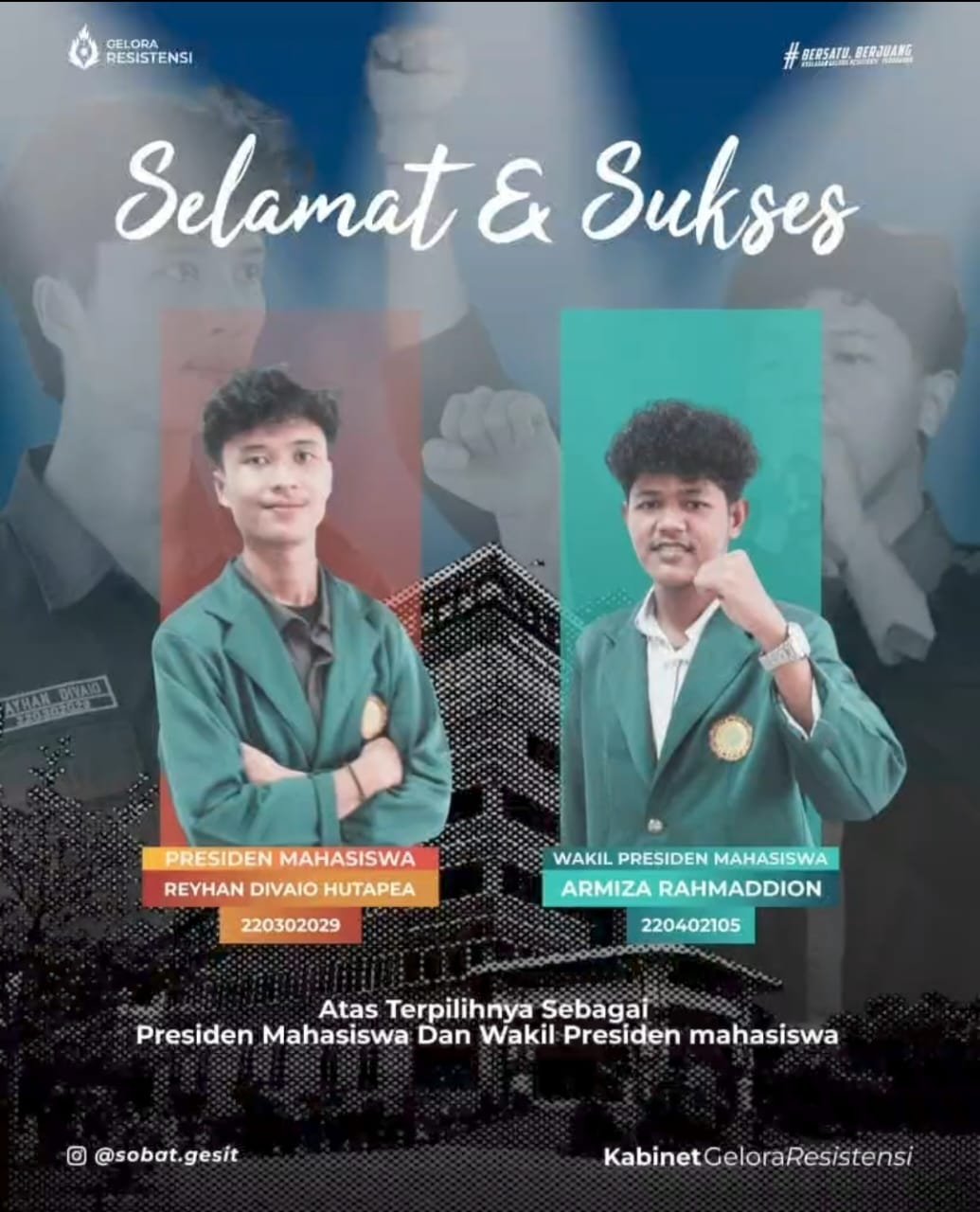 Pasangan Presma dan Wapresma Urut 1 ini telah meraih suara 2.113 dan secara sah mengalahkan para pesaingnya, yakni Rizki Ahmad Fauzi – Faturrahman Nobel dengan skor 1.747 Suara. Dari Total Suara 3.860 Pemilih