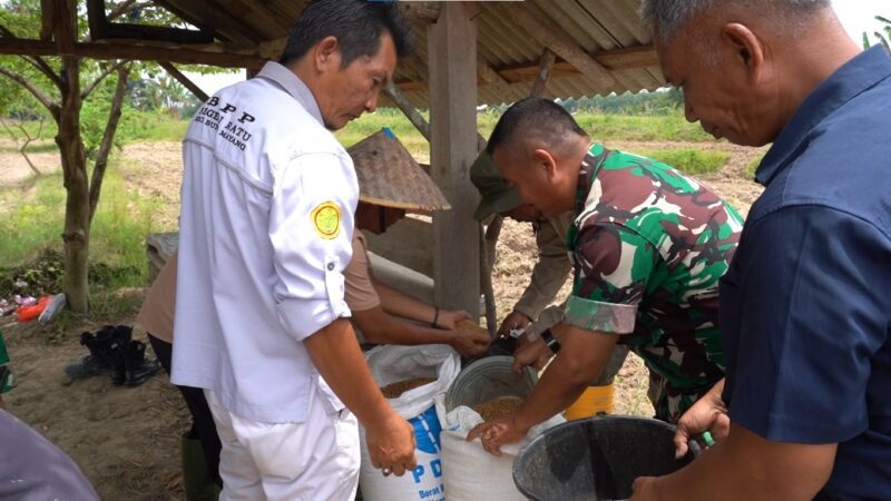 MARTAPURA || Dalam rangka mendukung program Ketahanan Pangan Nasional, PT Agrinas Pangan Nusantara bekerja sama dengan Pusat Latihan Tempur (Puslatpur) TNI Angkatan Darat melaksanakan kegiatan tabur benih padi varietas Gamagora 7 di lahan pertanian milik TNI AD yang berlokasi di Desa Peracak, Sabtu (08/11/2025).