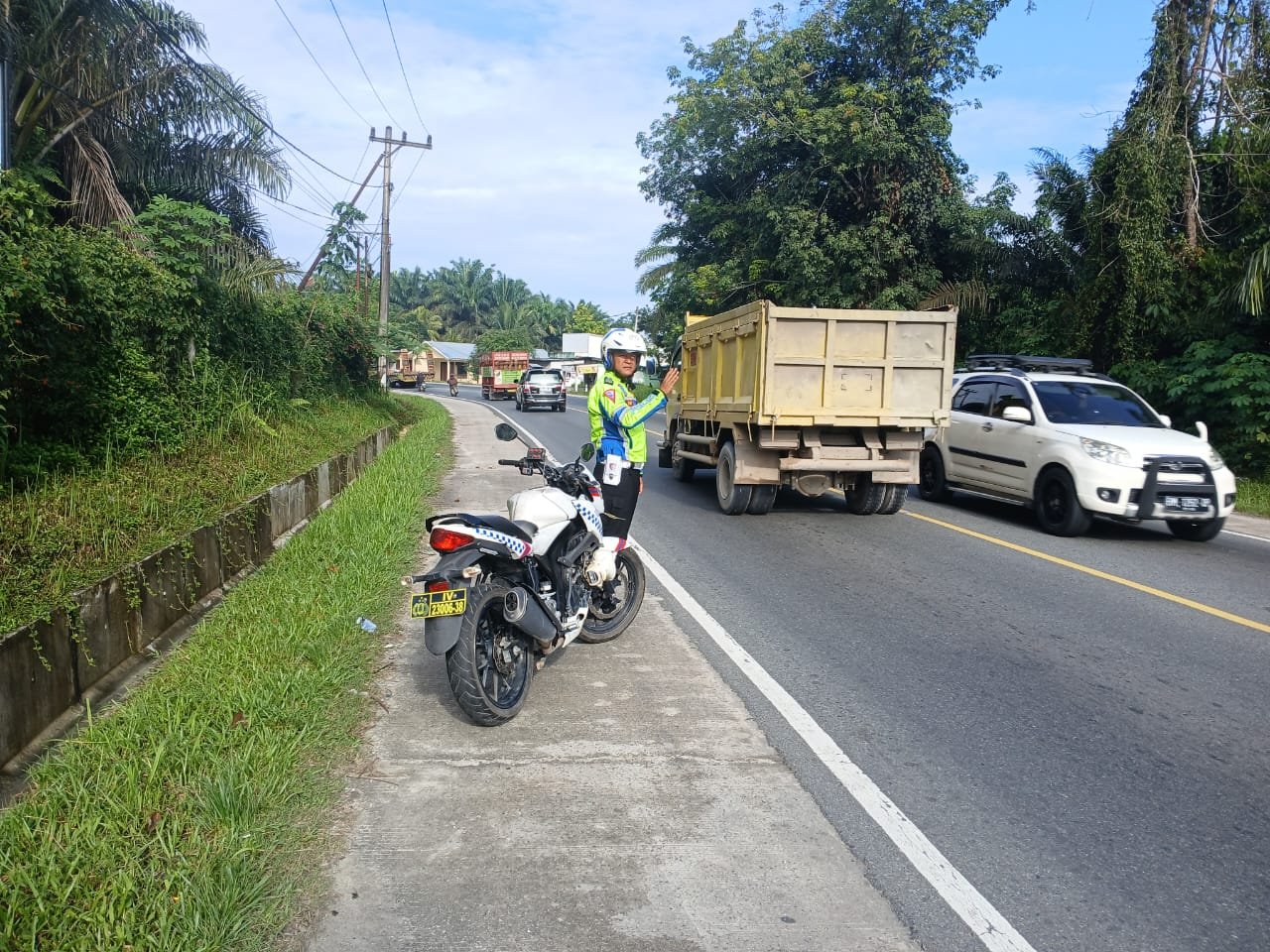 PELALAWAN II Unit Lantas Polsek Bandar Sei Kijang melaksanakan patroli dan pengaturan arus lalu lintas di Jalan Lintas Timur KM. 25 s/d 38 Kec. Bandar Seikijang, Kab. Pelalawan, Selasa (16/12/2025) pukul 08.00 WIB.